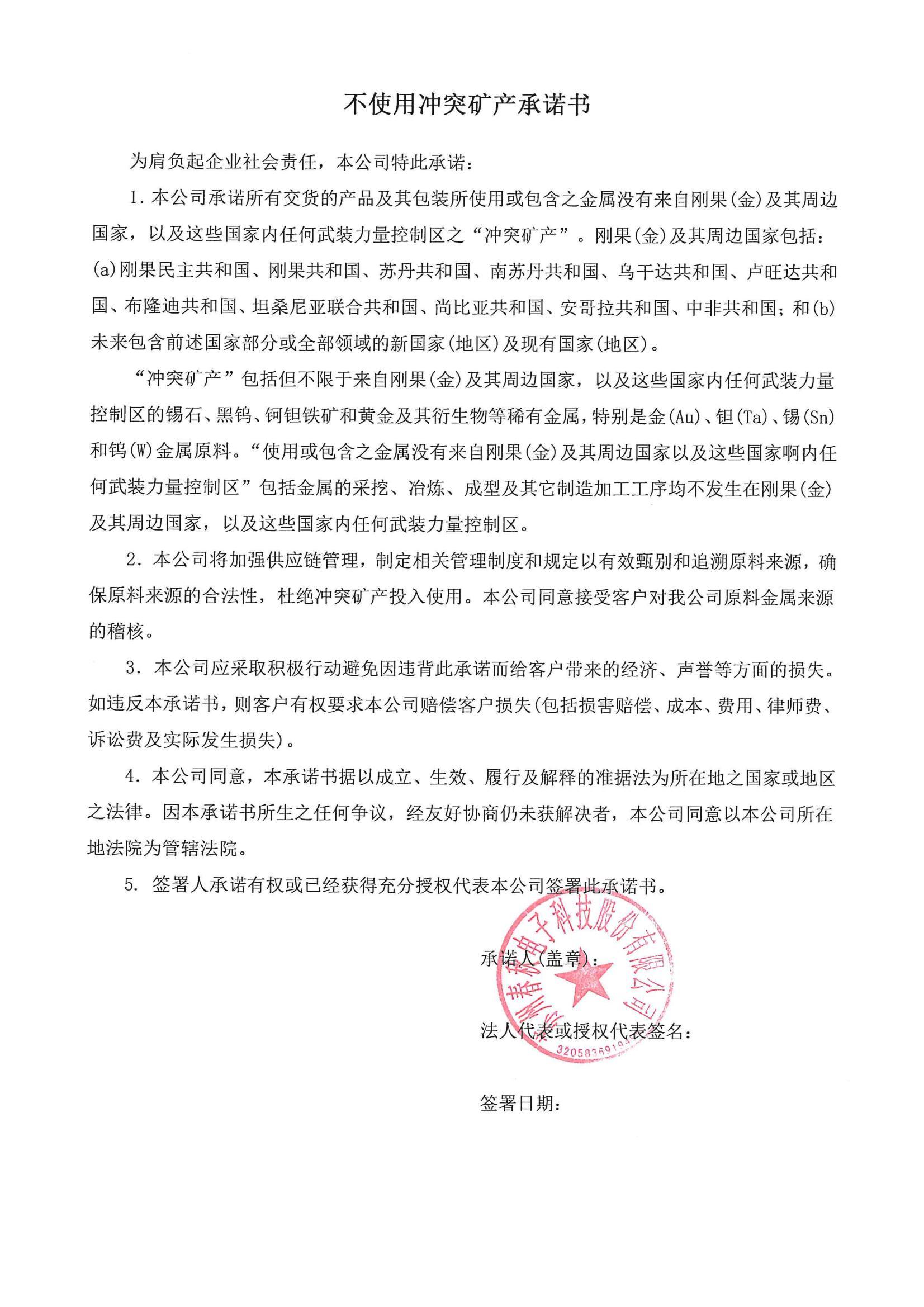 1.本公司承诺所有交货的产品及其包装所使用或包含之金属没有来自刚果(金)及其周边国家,以及这些国家内任何武装力量控制区之“冲突矿产”。刚果(金)及其周边国家包括:(a)刚果民主共和国、刚果共和国、苏丹共和国、南苏丹共和国、乌干达共和国、卢旺达共和国、布隆迪共和国、坦桑尼亚联合共和国、尚比亚共和国、安哥拉共和国、中非共和国;和(b)未来包含前述国家部分或全部领域的新国家(地区)及现有国家(地区)。