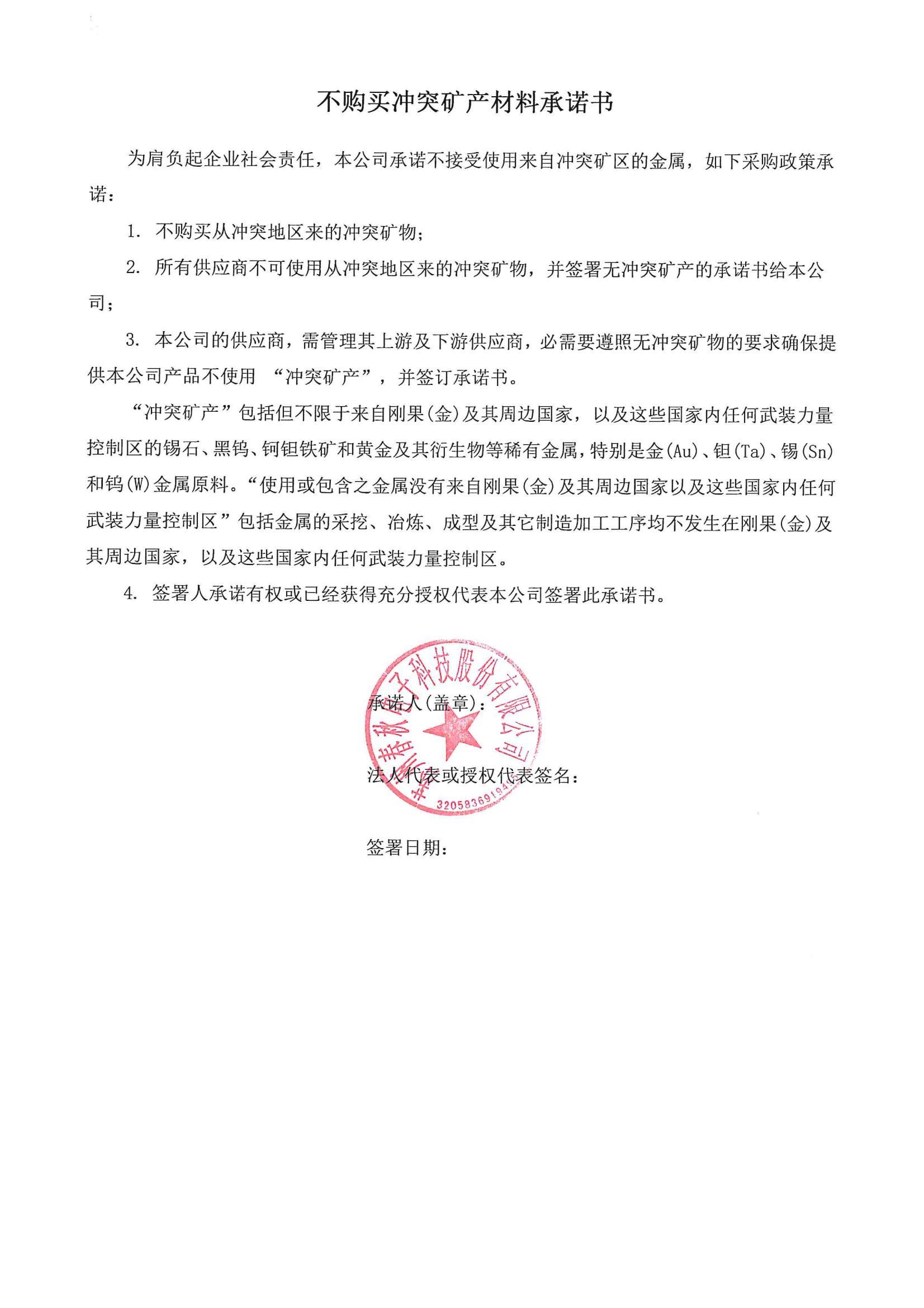 2. 所有供应商不可使用从冲突地区来的冲突矿物,并签署无冲突矿产的承诺书给本公司;